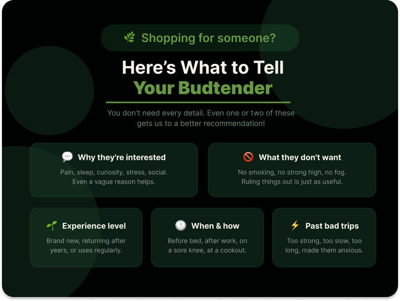 When you walk up to the counter and say "I'm buying this for someone else," the conversation shifts. Instead of asking about your preferences, we start asking about theirs: whether they've tried cannabis before, what they're hoping it helps with, how cautious they tend to be, and whether they have any strong feelings about format.